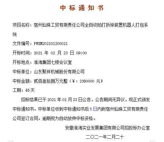 聚祥打包機(jī)招標(biāo)成功